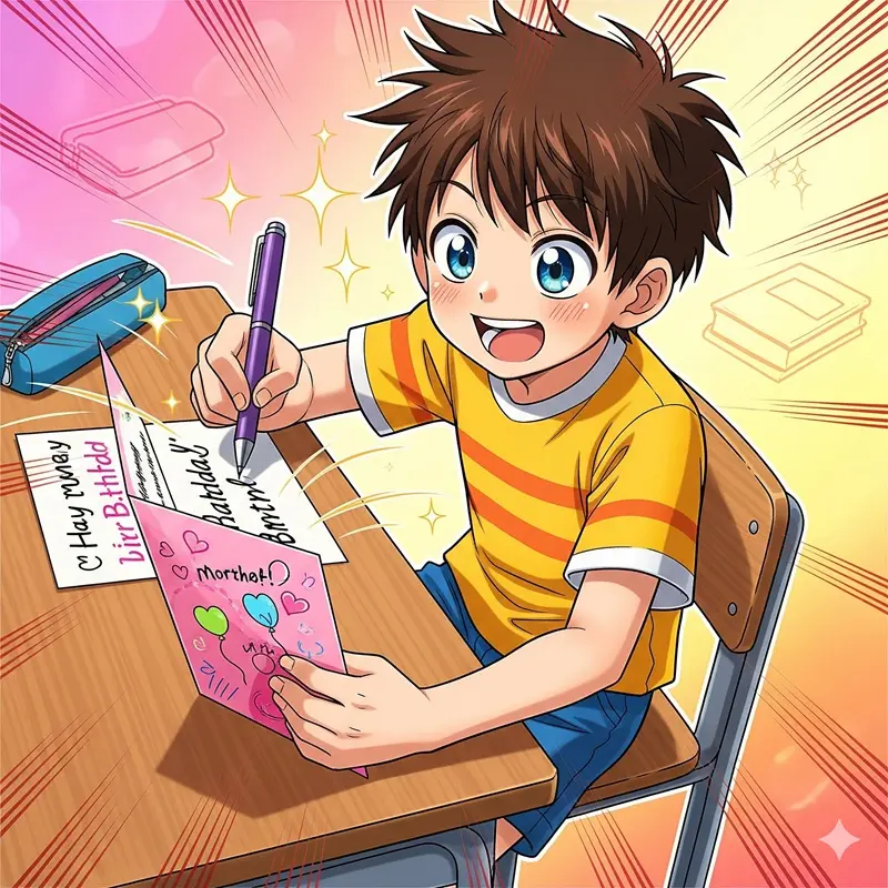 さあ、ペンを持ってカードを書こう! ママの最高の笑顔(えがお)が見れるといいね。